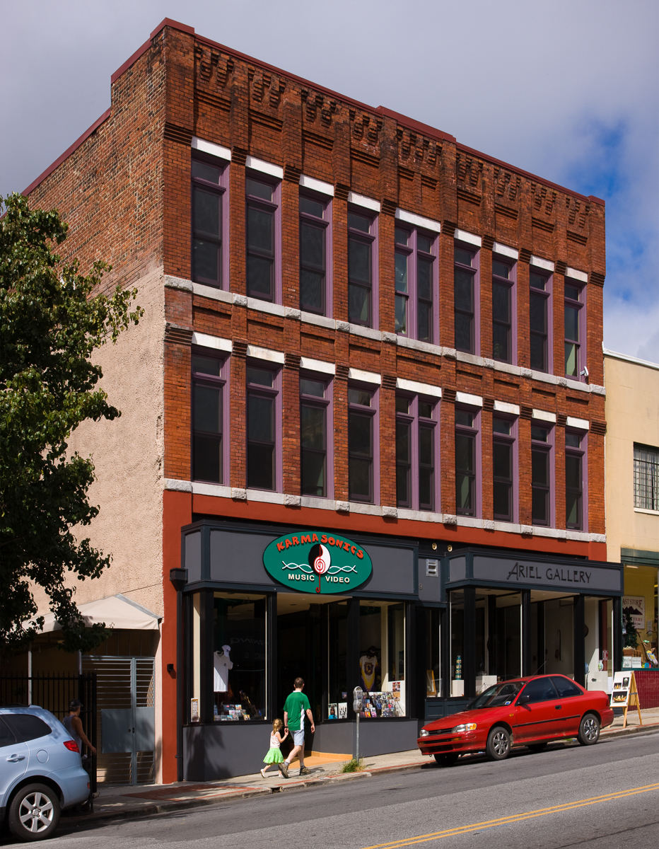 Constructed in 1890 by the prominent Hilliard family, 19-21 Biltmore Avenue was a mixed-use structure with two retail stores on the street level, doctors’ offices serving two generations of Hilliard physicians and an undertaker’s business on the second floor, and assembly halls serving local fraternal lodges on the third floor. In addition to the Knights of Pythias and Loyal Order of Moose, the building also housed the Central Labor Union offices and the Socialist Reading Room in the 1910’s. Beginning in 1930 the second and third floor were transformed into a small downtown hotel through extensive partitioning of the original large open rooms. Consistent with the national trends transforming downtown commercial properties, the building was converted in the early 1950’s to a single retail furniture store with the upper floors turned over to warehousing for the business. A major fire damaged portions of the upper floors, but a remarkable amount of original woodwork and detailing survives.